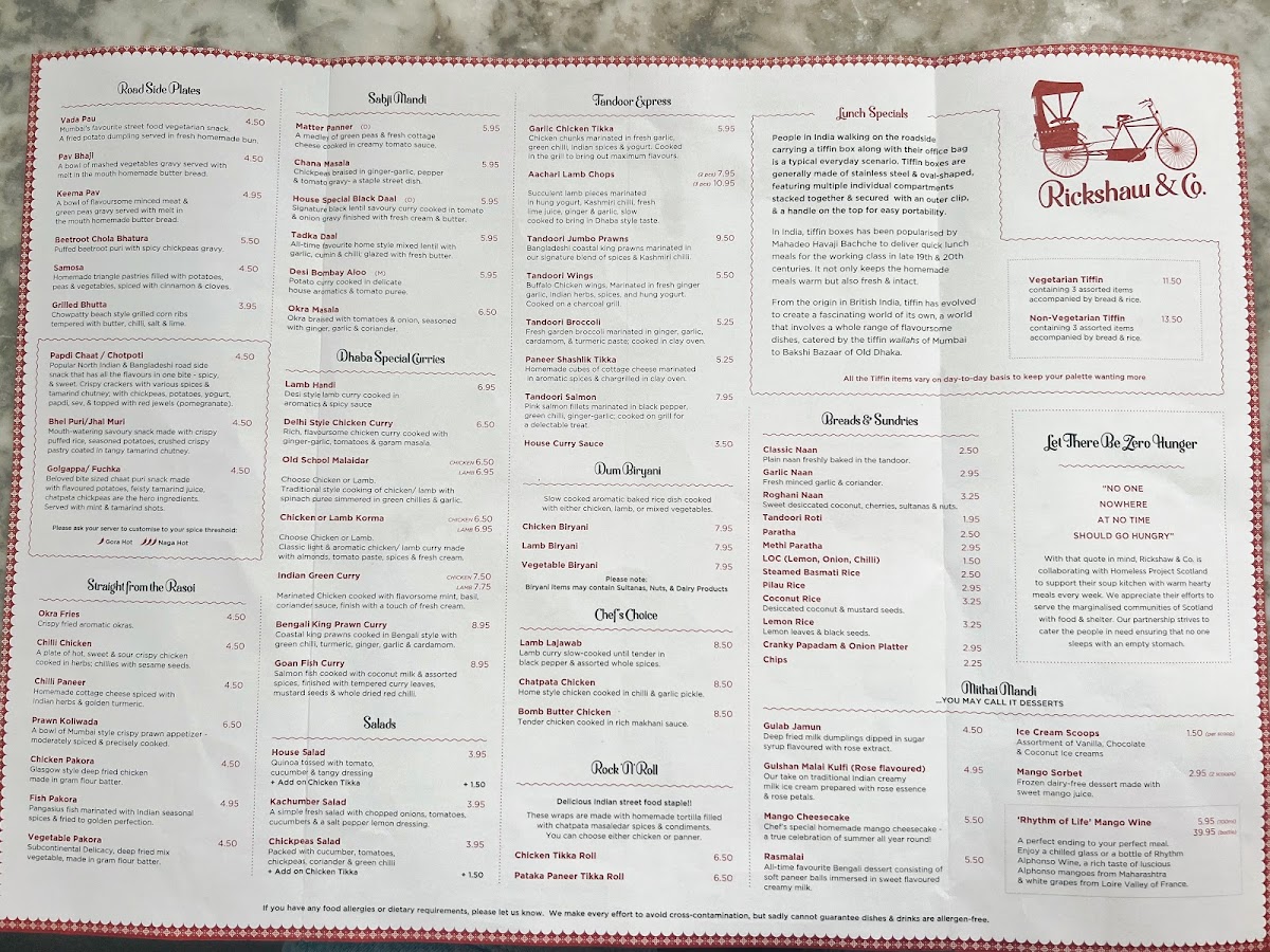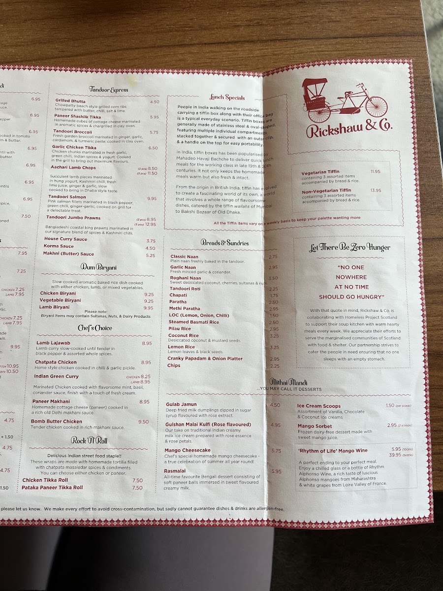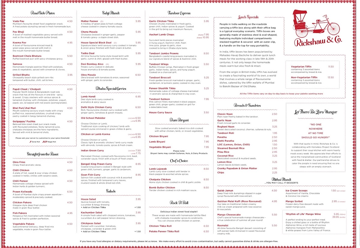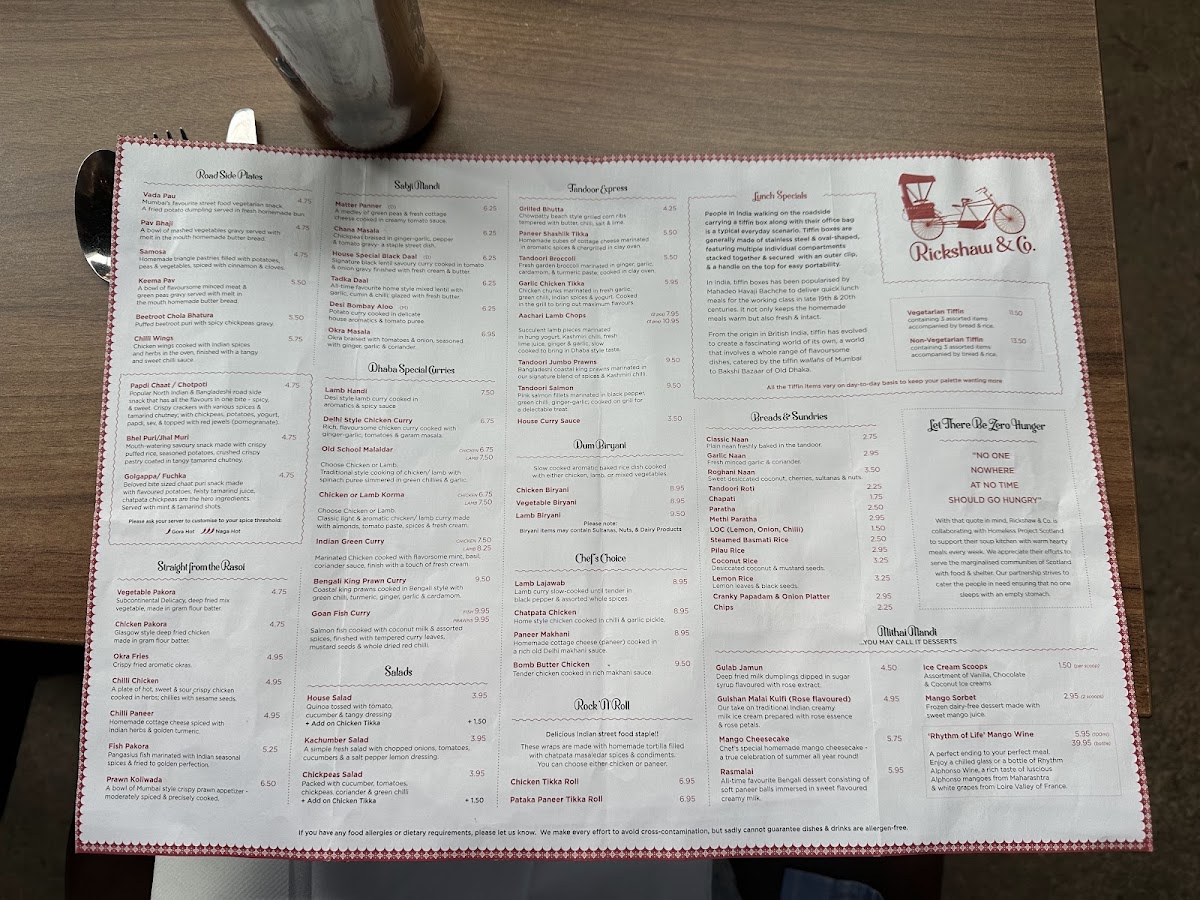 Rickshaw & Co delivers a vibrant and satisfying menu that captures the essence of Indian street food and classic comfort dishes, leaving a strong final impression. The Road Side Plates such as Vada Pau, Pav Bhaji, and Samosa Keema Pav set the tone with bold, authentic flavors, while richer selections like Lamb Lajawab, Chatpata Chicken, and Paneer Makhani from the Chef’s Choice menu showcase depth and indulgence. The tandoor offerings, including Paneer Shashlik Tikka, Garlic Chicken Tikka, and Aachari Lamb Chops, are particularly memorable for their smoky character. Comfort favorites like Chicken Biryani, Lamb Biryani, and Vegetable Biryani round out the experience, complemented perfectly by sides such as Garlic Naan and Roghani Naan. Desserts like Gulab Jamun and Mango Cheesecake provide a sweet finish, while creative drinks like the Lagaan Old-Fashioned and Slumdog Gimlet elevate the overall dining experience. Although prices aren’t listed, the variety and balance across categories-from street snacks to hearty curries and refreshing beverages-make the menu feel both thoughtfully curated and highly appealing.