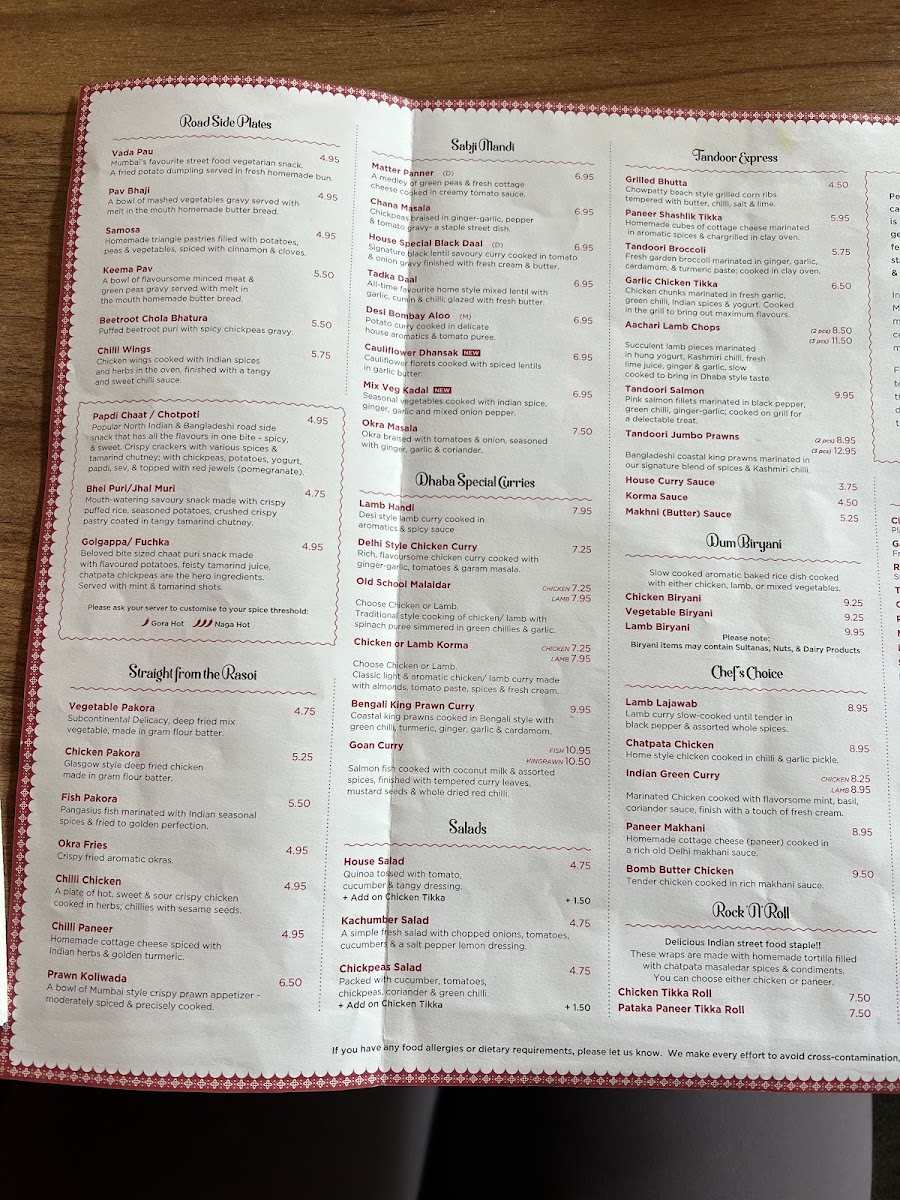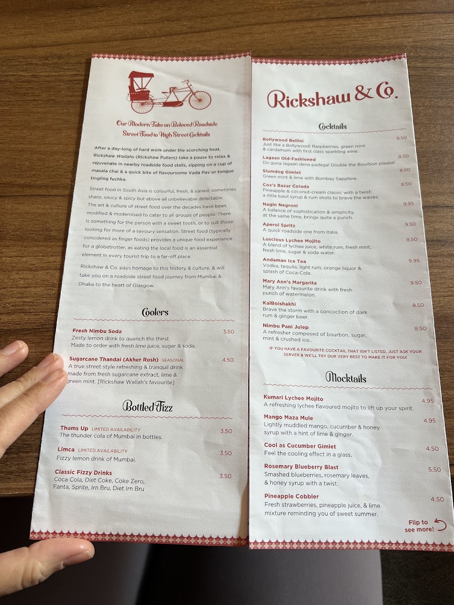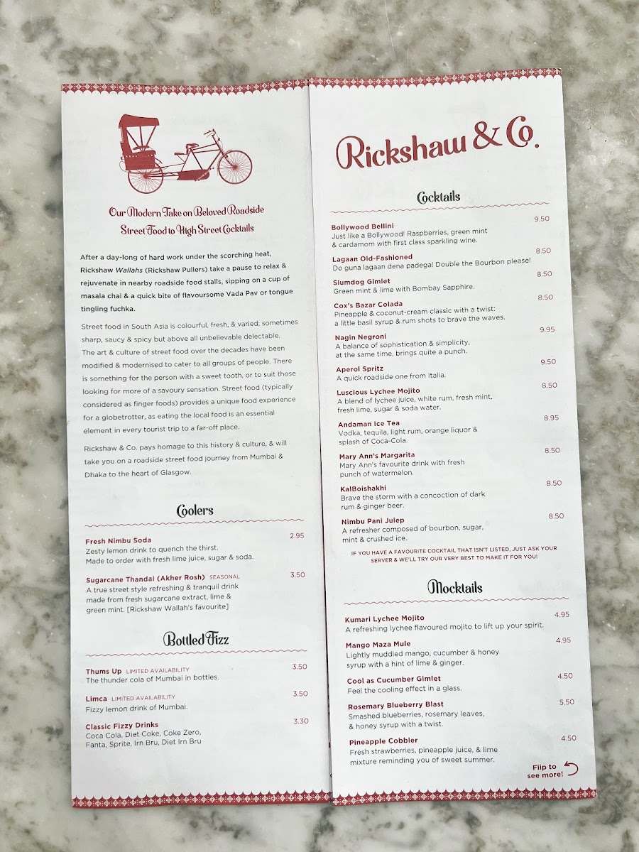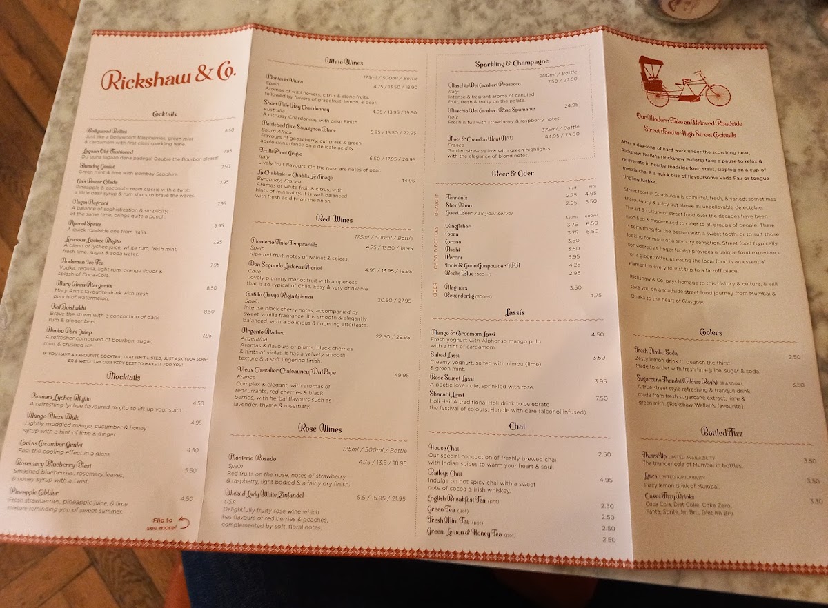 Rickshaw & Co delivers a vibrant and satisfying menu that captures the essence of Indian street food and classic comfort dishes, leaving a strong final impression. The Road Side Plates such as Vada Pau, Pav Bhaji, and Samosa Keema Pav set the tone with bold, authentic flavors, while richer selections like Lamb Lajawab, Chatpata Chicken, and Paneer Makhani from the Chef’s Choice menu showcase depth and indulgence. The tandoor offerings, including Paneer Shashlik Tikka, Garlic Chicken Tikka, and Aachari Lamb Chops, are particularly memorable for their smoky character. Comfort favorites like Chicken Biryani, Lamb Biryani, and Vegetable Biryani round out the experience, complemented perfectly by sides such as Garlic Naan and Roghani Naan. Desserts like Gulab Jamun and Mango Cheesecake provide a sweet finish, while creative drinks like the Lagaan Old-Fashioned and Slumdog Gimlet elevate the overall dining experience. Although prices aren’t listed, the variety and balance across categories-from street snacks to hearty curries and refreshing beverages-make the menu feel both thoughtfully curated and highly appealing.
